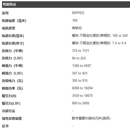 派克 R10 RIPPED 有鐵芯直線電機(jī),其抗齒槽力技術(shù),生產(chǎn)許多工業(yè)應(yīng)用所需的大推力 - 避免了傳統(tǒng)有鐵芯直線電機(jī)齒槽力帶來的粗糙度. 持續(xù)推力范圍 374 N (84 lbf) up to 1121 N (252 lbf) ,峰值推力范圍 1366 N (307 lbf) up to 4097 N (921 lbf), RIPPED系列是非常適合廣泛的極端苛刻的應(yīng)用。派克提供了模塊化的磁軌實(shí)現(xiàn)無長度限制的行程。電機(jī)連接器模塊可以輕松快捷的安裝,同時降低總體維護(hù)成本。超高柔性電纜為標(biāo)準(zhǔn)配置。幾乎接近于無鐵芯電機(jī)的零齒槽力使RIPPED系列堪稱高推力和極其平滑運(yùn)動的首選。