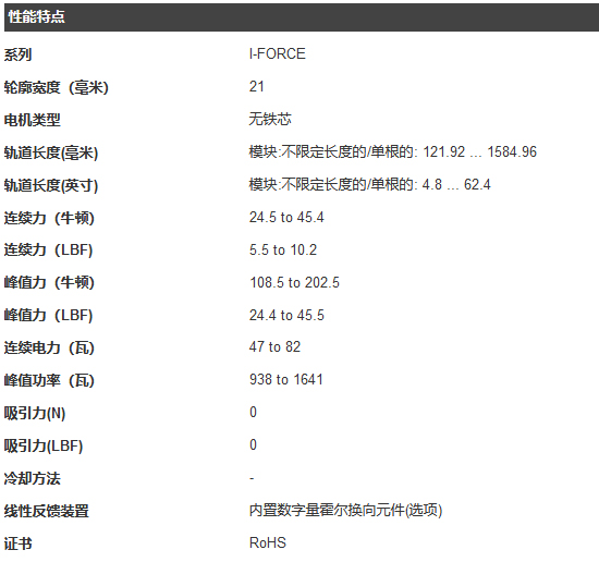 I-Force 110 無鐵芯直線電機峰值推力可達 200N, 卓越的加速度和緊湊的體積. 21mm 寬的無鐵芯設(shè)計具有零齒槽效應(yīng)力,同時工字型骨架繞組提供很高的推力/體積密度比和優(yōu)越的散熱效果