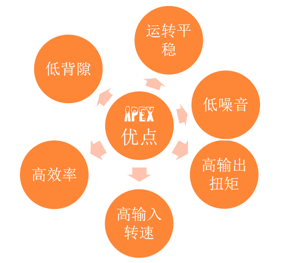 APEX減速機(jī)于伺服控制的應(yīng)用上,發(fā)揮了良好的伺服剛性效應(yīng),準(zhǔn)確的精密定位控制,在運(yùn)轉(zhuǎn)平臺上具備了低背隙,高效率,高輸入轉(zhuǎn)速,高輸入扭矩,運(yùn)轉(zhuǎn)平順,低噪音等特性,此外,于外觀及結(jié)構(gòu)設(shè)計上也力求輕薄短小,緊湊并輕量化的條件發(fā)展,它讓伺服馬達(dá)能在更高,更有效率的情形下運(yùn)轉(zhuǎn),并減低其回饋的負(fù)載慣量,并增加輸出的扭矩。